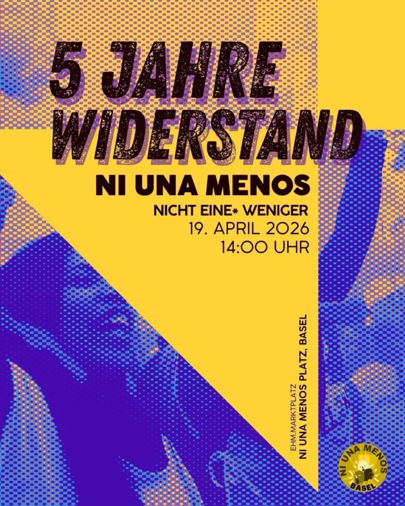 Nun trauern und kämpfen wir bereits seit 5 Jahren als Ni Una Menos Basel gegen Feminizide und patriarchale Gewalt. Neben der Organisation und Durchführung von Gedenkprotesten, Demonstrationen und Bildungsveranstaltungen haben wir in den letzten 2 Jahren auch an einer Broschüre gearbeitet. Diese Broschüre, welche in Zusammenarbeit mit vielen anderen Personen und Kollektiven entstanden ist, wollen wir nun mit euch gemeinsam einweihen. Deshalb laden wir euch am 19.4.26 herzlichst zu unserer Jubiläumsfeier und Broschürenpräsentation auf dem Ni Una Menos-Platz ein. Kommt und feiert mit uns, lernt mit uns, trauert mit uns, seid wütend mit uns, organisiert euch mit uns, nehmt Raum ein mit uns, esst mit uns, trinkt mit uns, tanzt mit uns und singt mit uns.